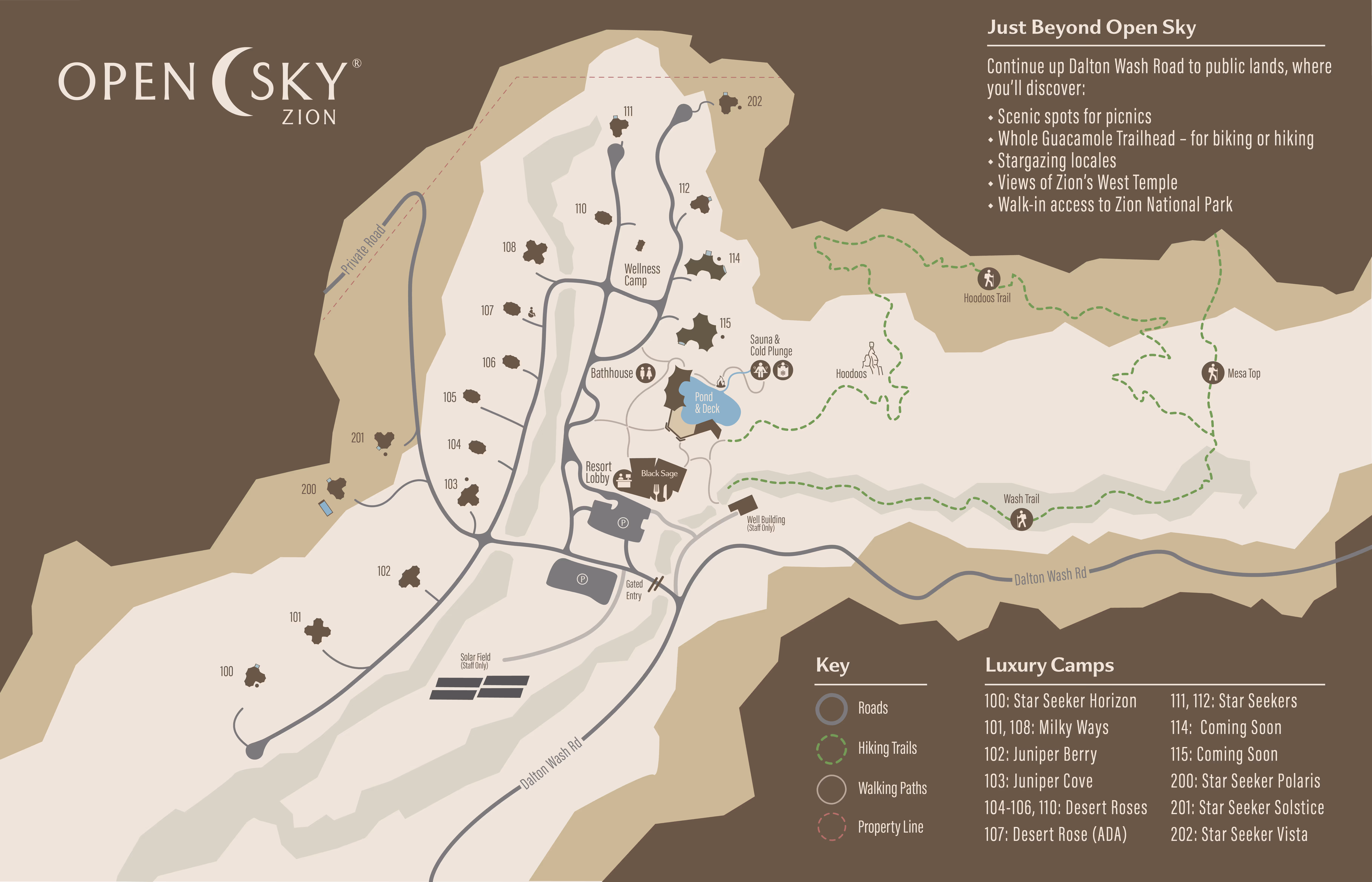 This new luxury camp type at Open Sky is our most expansive of the Star Seeker experiences. This one-of-a-kind camp is elevated in both setting and amenities.